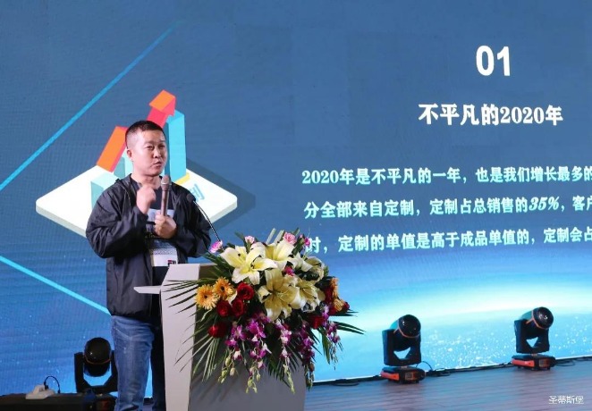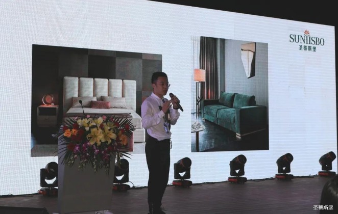 华灯璀璨的开场仪式,点燃了现场如火如荼的气氛。z6.com尊龙集团营销总经理陈玉伟先生对晚会进行了主题发言,他对2020年的营销工作进行了总结,并着重从营销工作部署、重点项目开展、产品整合、拎包帮扶、渠道运营和移动+定制整装优势等方面对2021年的营销工作做了全面的统筹规划。同时,他还讲解了“美国梦凯莎床垫”新品的产品工艺、市场优势、产品定位,使经销商对我们的新产品拥有更深入的认识和了解。